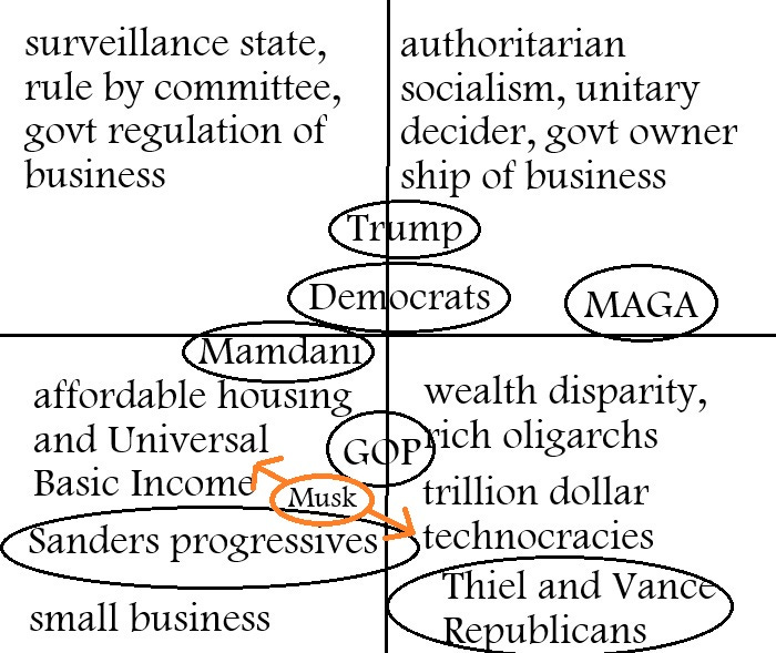 Since Americans don’t recognize Socialism as its being presented to them the results of the next election will likely revolve around the optics. While subsidizing technology companies is not Socialism, SNAP is. There are limits to that of course. The success of the Mamdani experiment may go a long way toward making “people” of left hand quadrant Socialism move visible. Authoritarian Socialism is more highly visible and likely to be rejected, just on the optics, that would likely precipitate a shift for MAGA to the lower right and a Vance presidency is not nearly as impossible as some believe. The appeal of left-hand quadrant socialism is not that powerful, the Bernie Sanders Progressives. Most of the economically disadvantaged have good jobs, it’s just a matter for them of better and best possible outcome. That is another factor in favor of the Vance ticket.